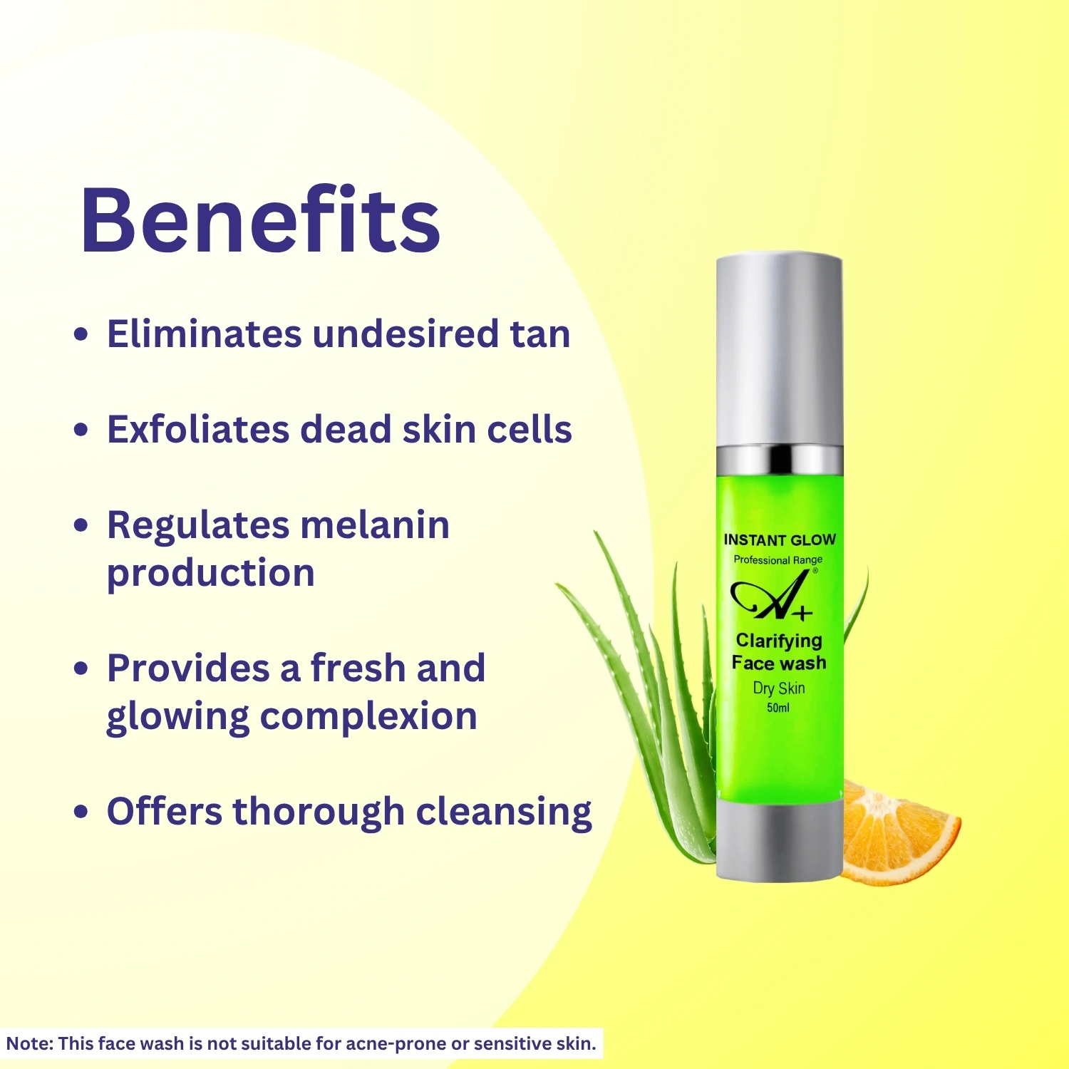 A+ Clarifying Facewash is a gentle yet powerful skincare essential, designed to cleanse, purify, and hydrate normal to dry skin. Formulated with Apple Extract, Orange Extract, and Aloe Vera Extract, this face wash deeply removes dirt, excess oil, and impurities without disrupting the skin’s natural moisture balance. The rich blend of fruit extracts delivers antioxidant protection, brightens the skin, and enhances natural radiance, making it an ideal solution for dull, tired, or tanned skin.