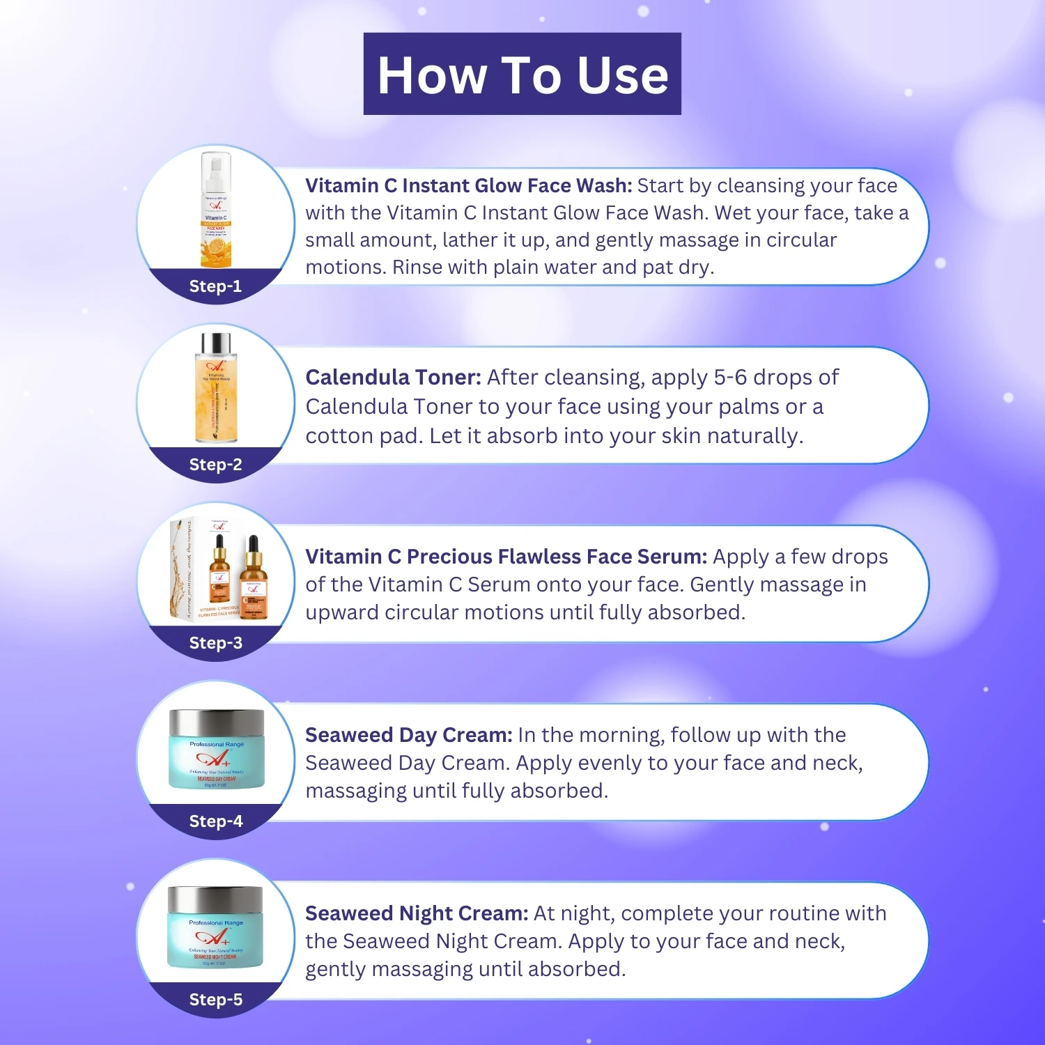 Infused with powerful natural ingredients like Vitamin C, Calendula, and Seaweed Extract, this skincare system deeply nourishes, hydrates, and rejuvenates the skin, leaving it looking refreshed, matte, and glowing. Each step is carefully crafted to purify, protect, and restore skin health, making it an ideal daily solution for those struggling with excess oil, blemishes, and pigmentation issues.