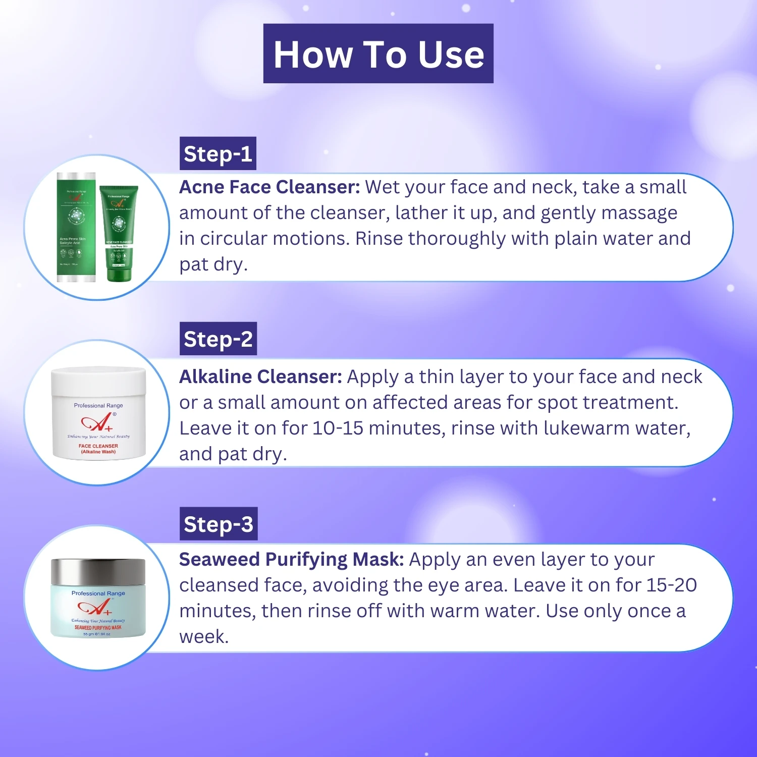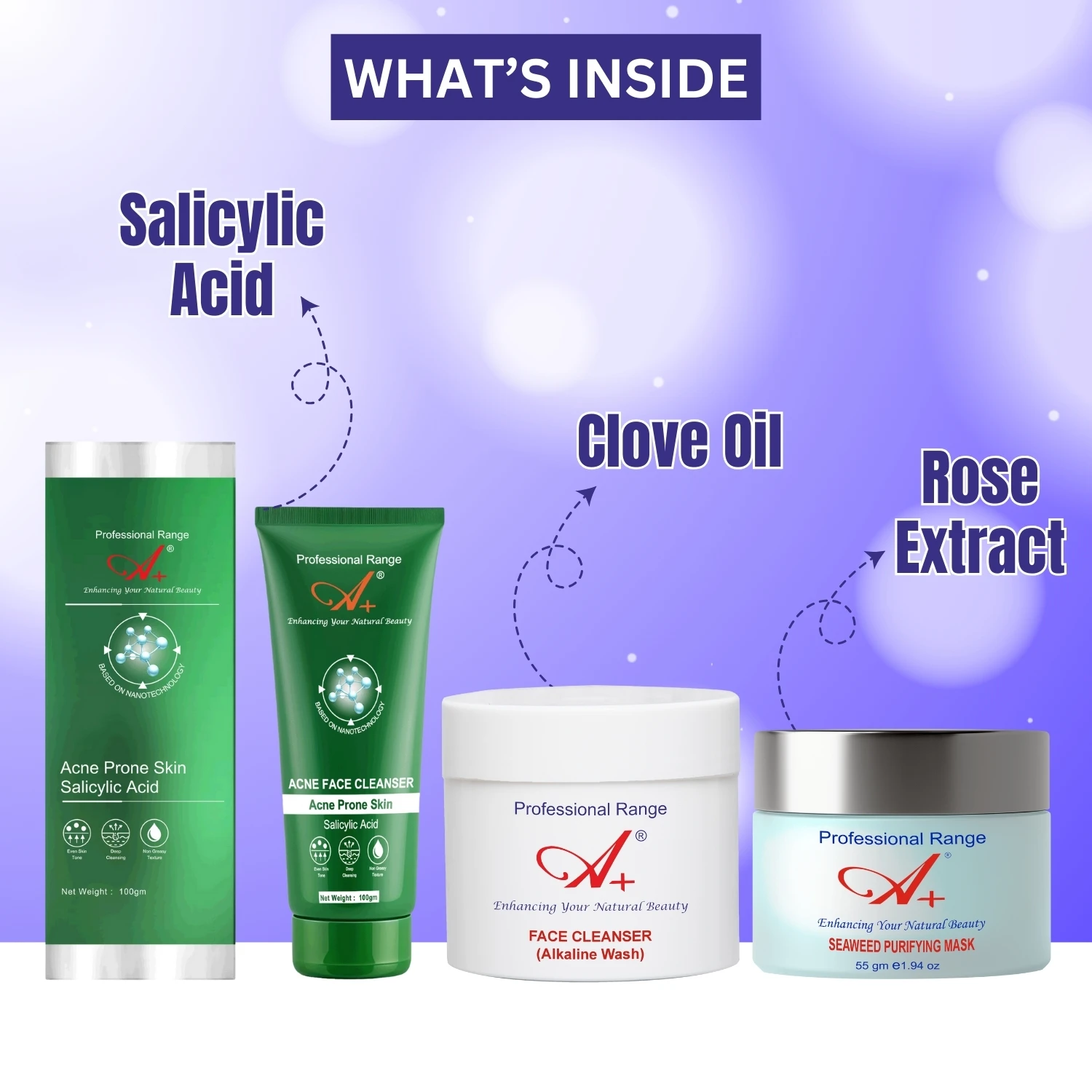 A+ Acne and Oily Skin Care Combo Pack is a 3-step skincare routine designed to combat acne, regulate excess oil, and promote a clear, healthy complexion. This skincare combo includes:
