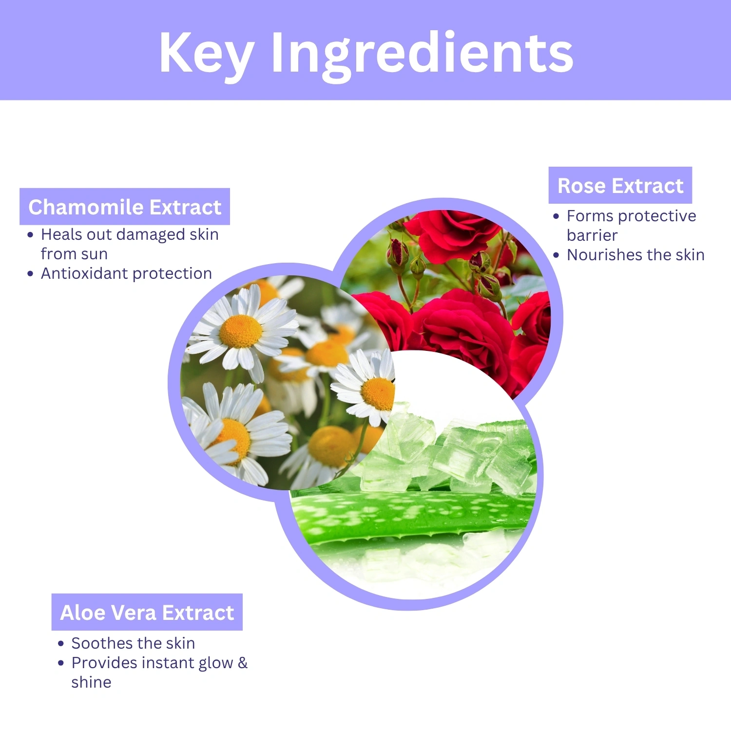 - Soothes and calms the skin with aloe vera and chamomile extracts