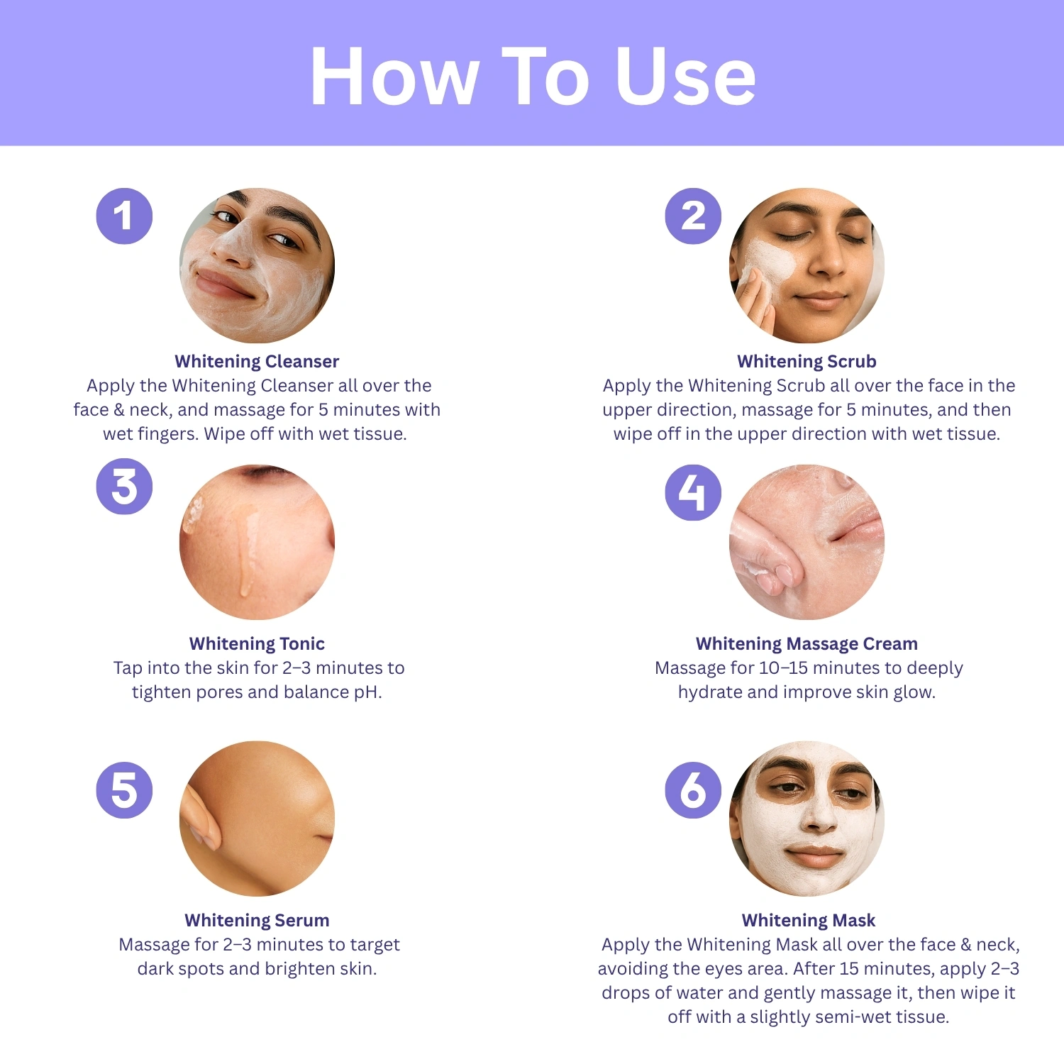 Achieve a visibly brighter, clearer, and more even complexion with the Advanced Whitening Facial Kit, a professional 6-step skincare treatment designed to deeply cleanse, hydrate, and rejuvenate the skin. This salon-grade skin whitening facial kit delivers instant glow while improving skin texture and tone with regular professional use.
