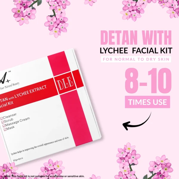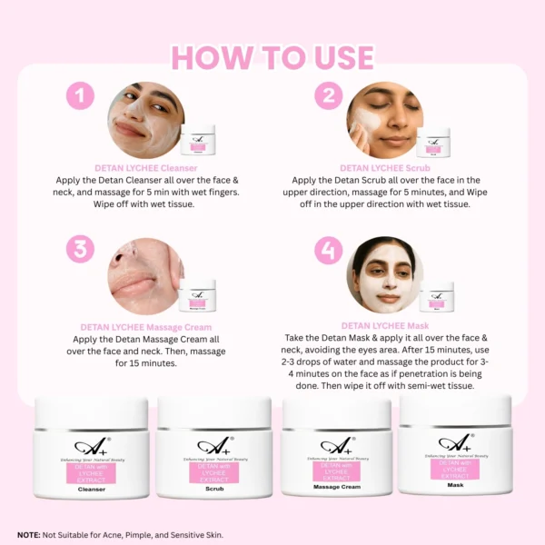 - Step 1 – Cleanser: Gently massage the Detan with Lychee Extract Cleanser for 5 minutes on the face and neck. Wipe off with a wet tissue.