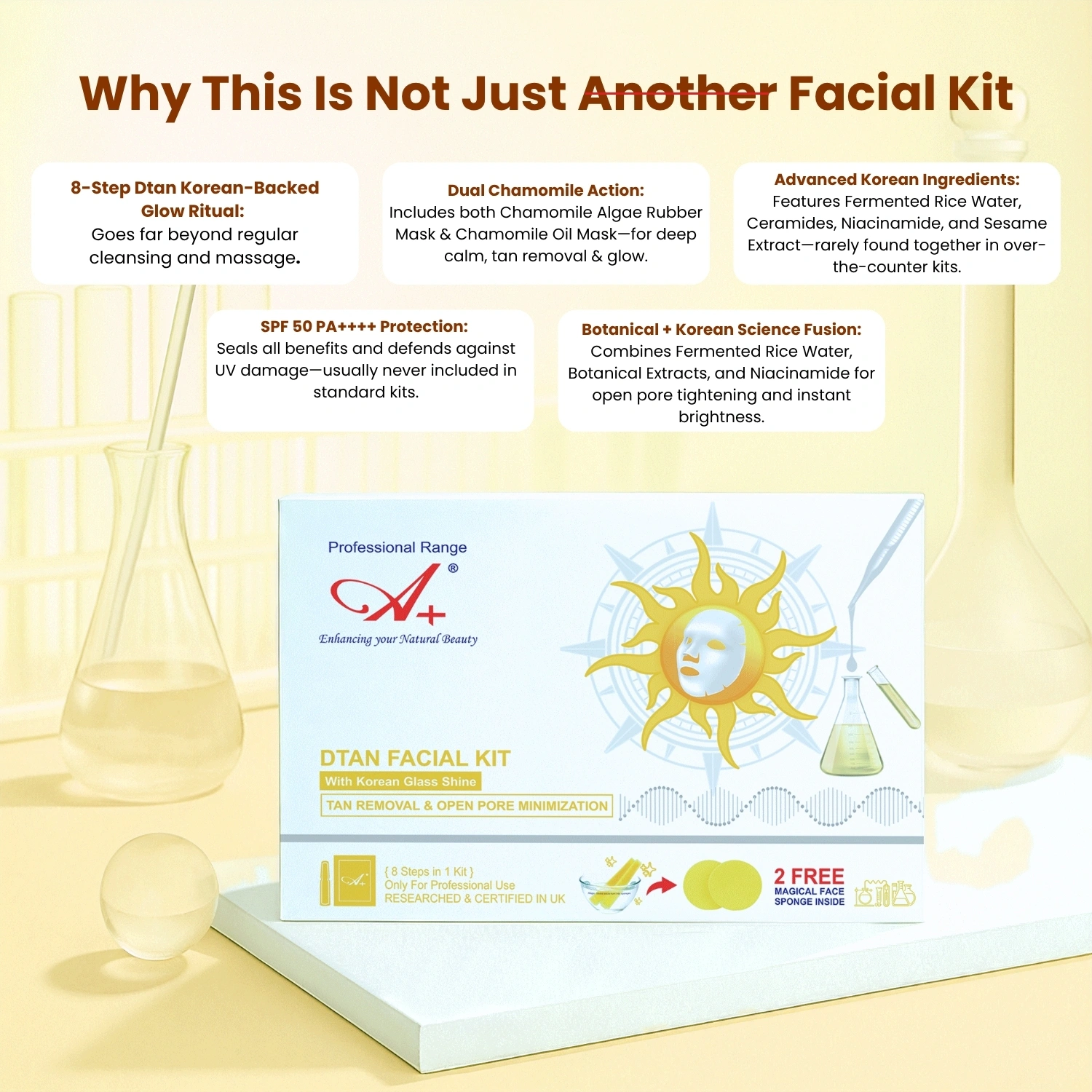 The DTAN Facial Kit with Korean Glass Shine is a targeted 8-step facial treatment that helps remove sun-induced tan, reduces open pores, and improves overall skin tone and texture. Developed using Korean-inspired skincare science, this advanced facial system is ideal for people looking to reverse dullness, tanning, and skin fatigue caused by daily exposure to pollution and sun.
