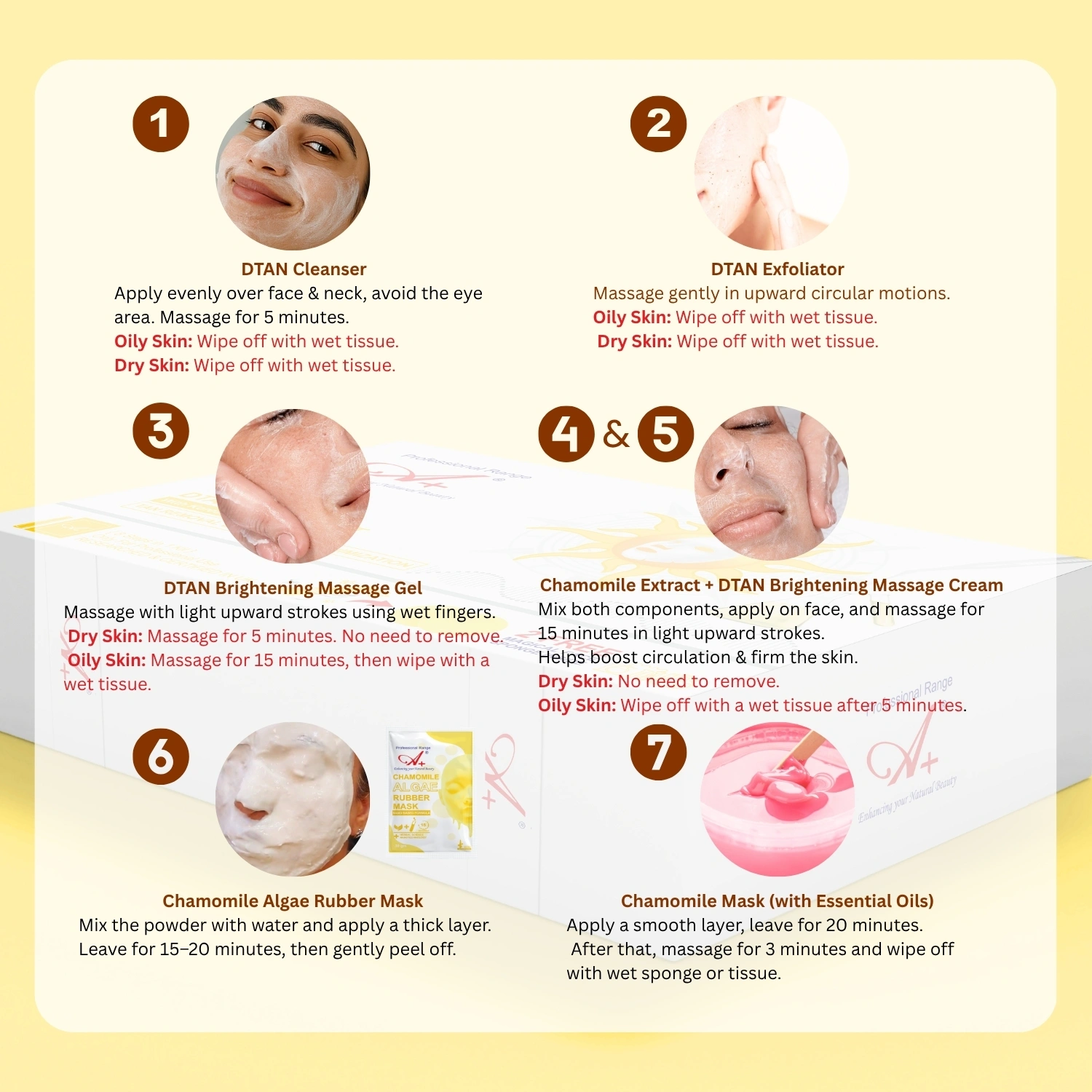 The facial begins with the Dtan Cleanser to remove dirt and tan buildup, followed by the Dtan Exfoliator, which unclogs pores and smoothens texture. The Dtan Brightening Massage Gel restores radiance and boosts microcirculation. Chamomile Extract, Brightening Massage Cream, and the Chamomile Algae Rubber Mask work together to soothe, hydrate, tighten pores, and nourish the skin deeply. The final step includes SPF 50 PA+++ to protect your freshly treated skin from further sun damage.