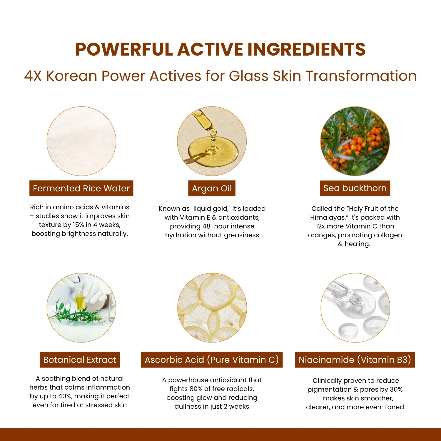 - Enriched with Korean Botanicals & Essential Oils: Infused with Aloe Vera, Chamomile Extract, Argan Oil, Fermented Rice Water, Niacinamide, Pea Extract, and Vitamin C to soothe, nourish, brighten, and rejuvenate the skin.