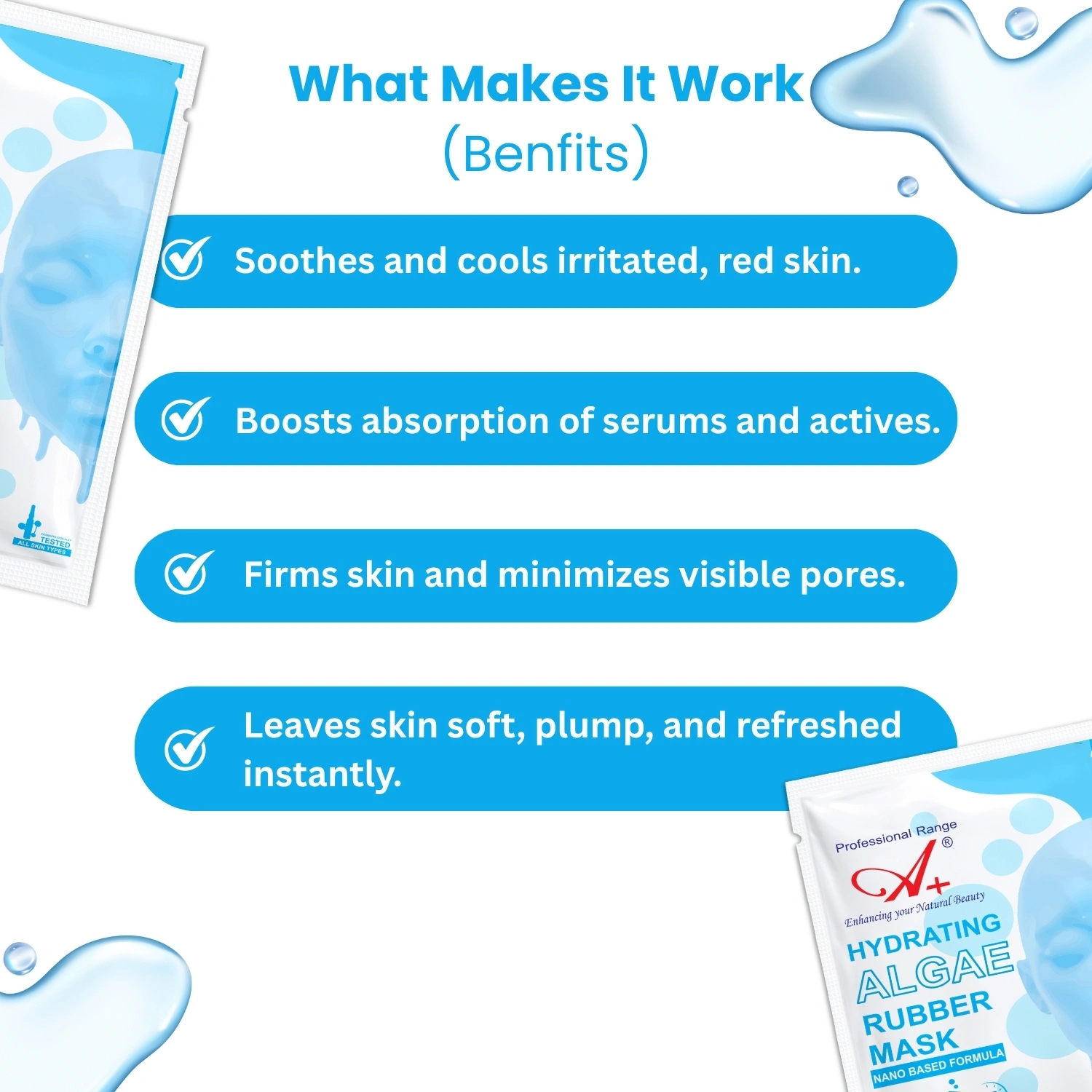 Give your skin a boost of deep hydration and a fresh, healthy glow with the A+ Hydrating Algae Rubber Mask—a salon-style peel-off treatment designed to remove dirt, pollution, and dullness in just one use. Powered by Vitamin E, Olive Oil, and Aloe Vera Gel Extract, this hydrating formula nourishes the skin from within, improves texture, and restores natural radiance. The mask helps calm irritation, deeply moisturizes dry and stressed skin, and leaves your face feeling soft, supple, and glowing. Just mix the powder with water, apply a thick layer, and peel it off after 15–20 minutes to reveal smoother, brighter, and visibly refreshed skin. Perfect for home facials or professional salon treatments, this mask suits all skin types.