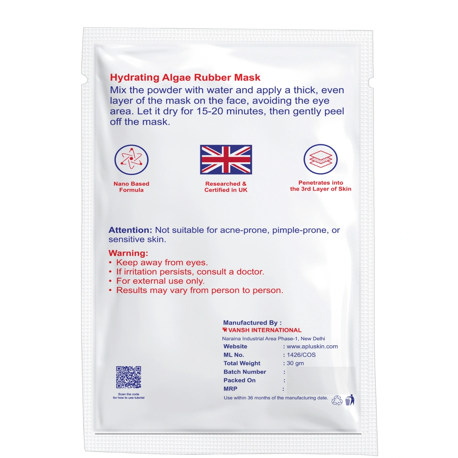 Experience instant hydration and a radiant glow with the Hydrating Algae Rubber Mask, also known as a peel-</strong>off, mould, or goji mask. Specially formulated for both men and women, this unique mask is enriched with Olive Oil, Vitamin E, and Aloe Vera Gel Extract to deeply nourish, soothe, and brighten the skin. The algae-based formula helps lock in moisture, calm irritation, and leave your skin feeling soft, supple, and refreshed. Easy to use, just mix the powder with water, apply a thick layer, and peel it off after 15–20 minutes to reveal visibly brighter and more glowing skin. Ideal for all skin types, perfect for home facials or salon-like pampering sessions. Note: not suitable for acne-prone, pimple-prone and sensitive skin (please avoid).