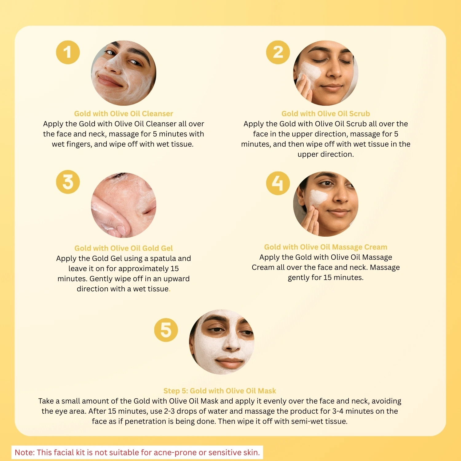 - Step 2: Gold + Olive Oil Scrub: Massage in upward circular motions for 5 minutes to exfoliate dead skin cells. Wipe off with a wet tissue.