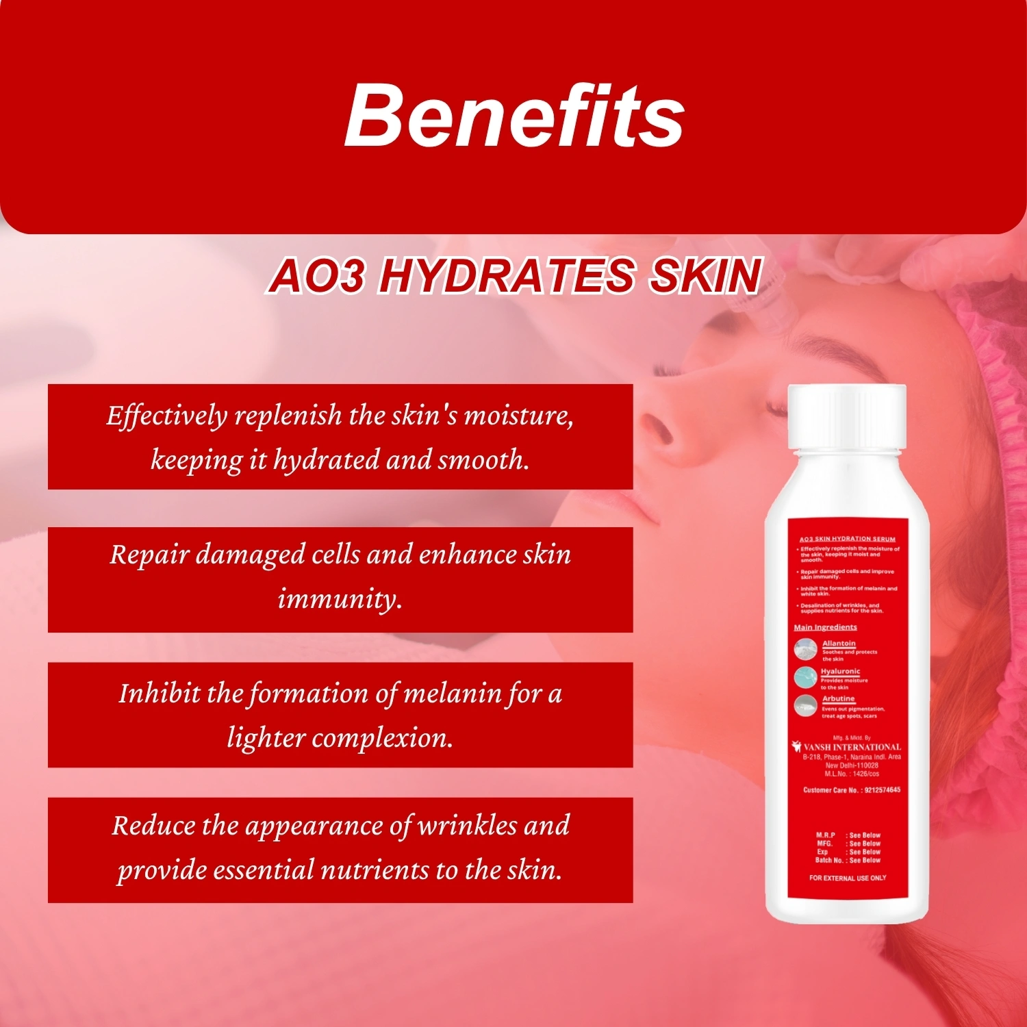 This Hydra Facial Seum AO3 is Enriched with Allantoin, Hyaluronic Acid, and Arbutin, this serum helps calm redness, deeply moisturize, and improve skin texture. It also works to reduce melanin production, promoting a more even and radiant skin tone while minimizing the appearance of fine lines and wrinkles.
