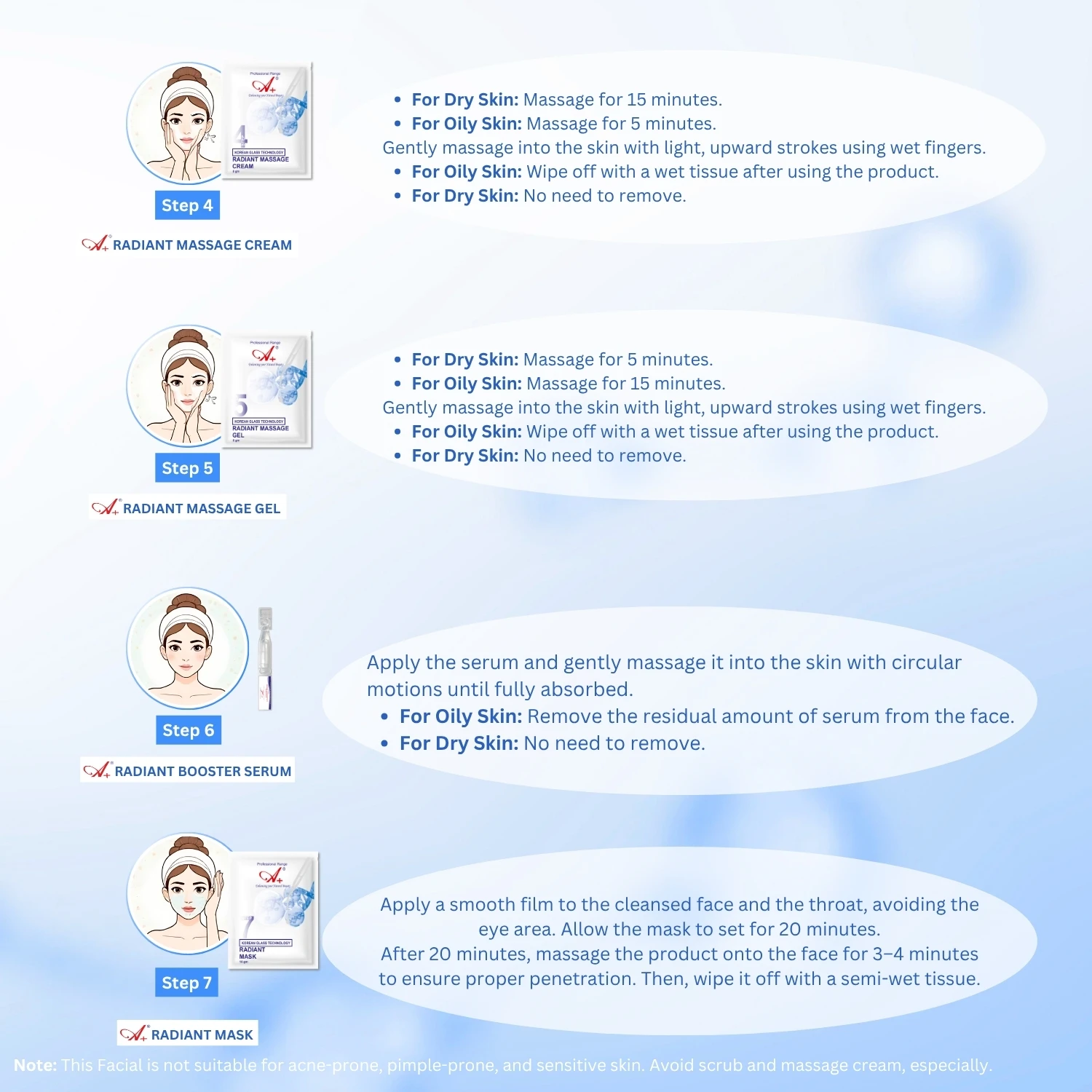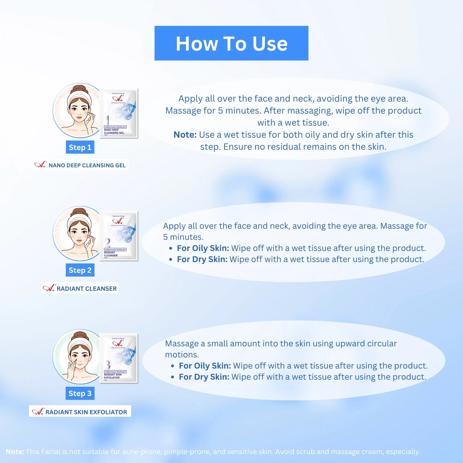 Important: This Facial is not suitable for acne-prone, pimple-prone, and sensitive skin. Avoid scrub and massage cream, especially.