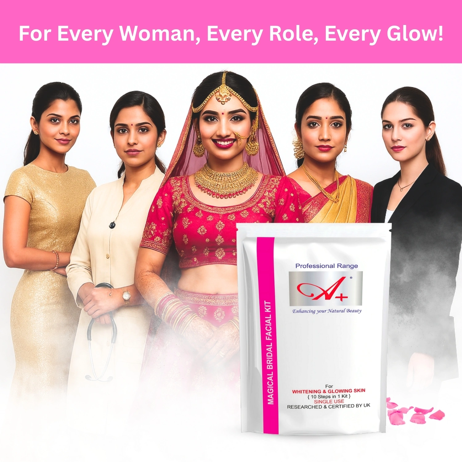 Get ready for your big day with the A+ Magical Bridal Facial Kit, expertly crafted to deliver a salon-like glow at home. Rated as the best facial kit for glowing skin, this premium formula deeply penetrates to remove impurities and reveals a radiant, diamond-like complexion. Whether you are looking for a bridal facial kit for immediate radiance or a long-term skincare solution, our kit hydrates, revitalizes, and perfects your skin tone. Suitable for all skin types, it is the ultimate secret to a flawless bridal look.