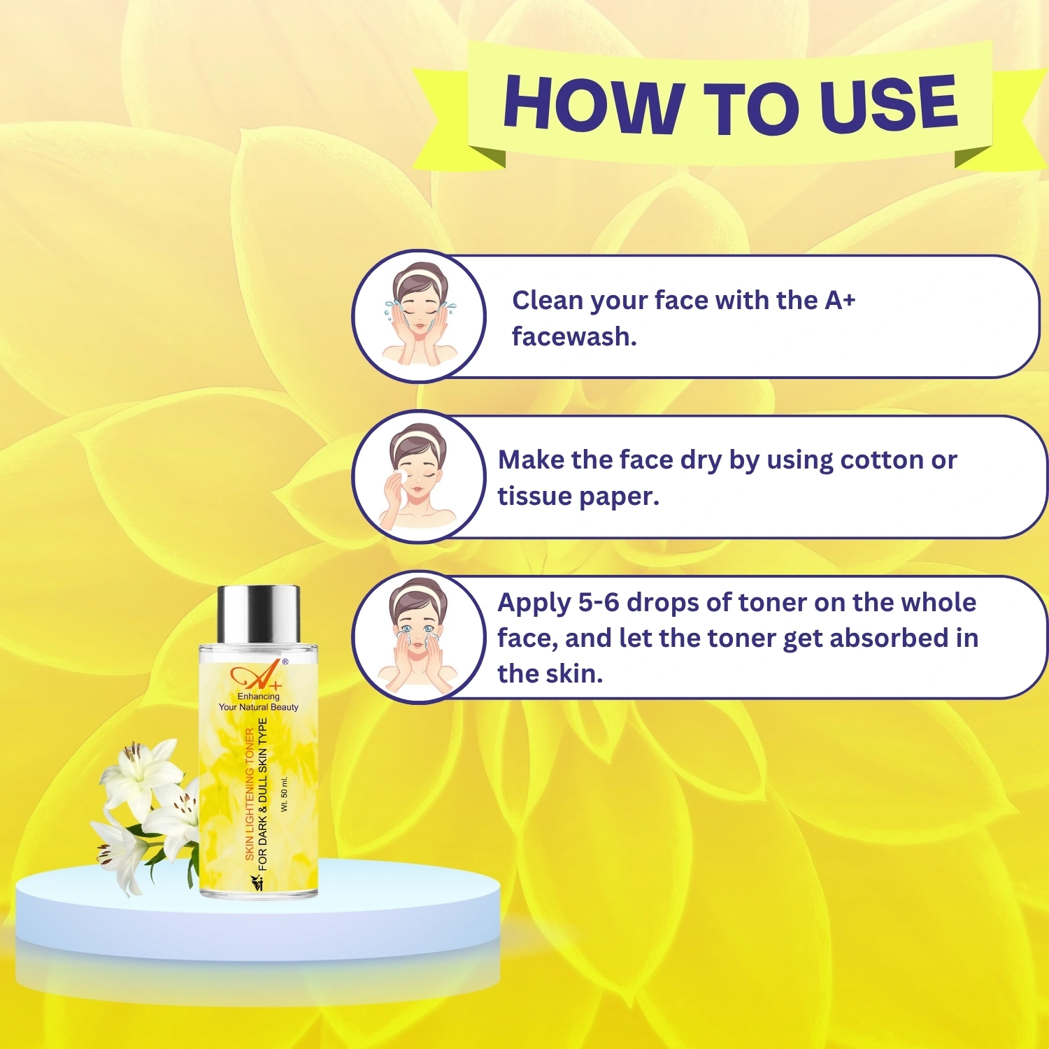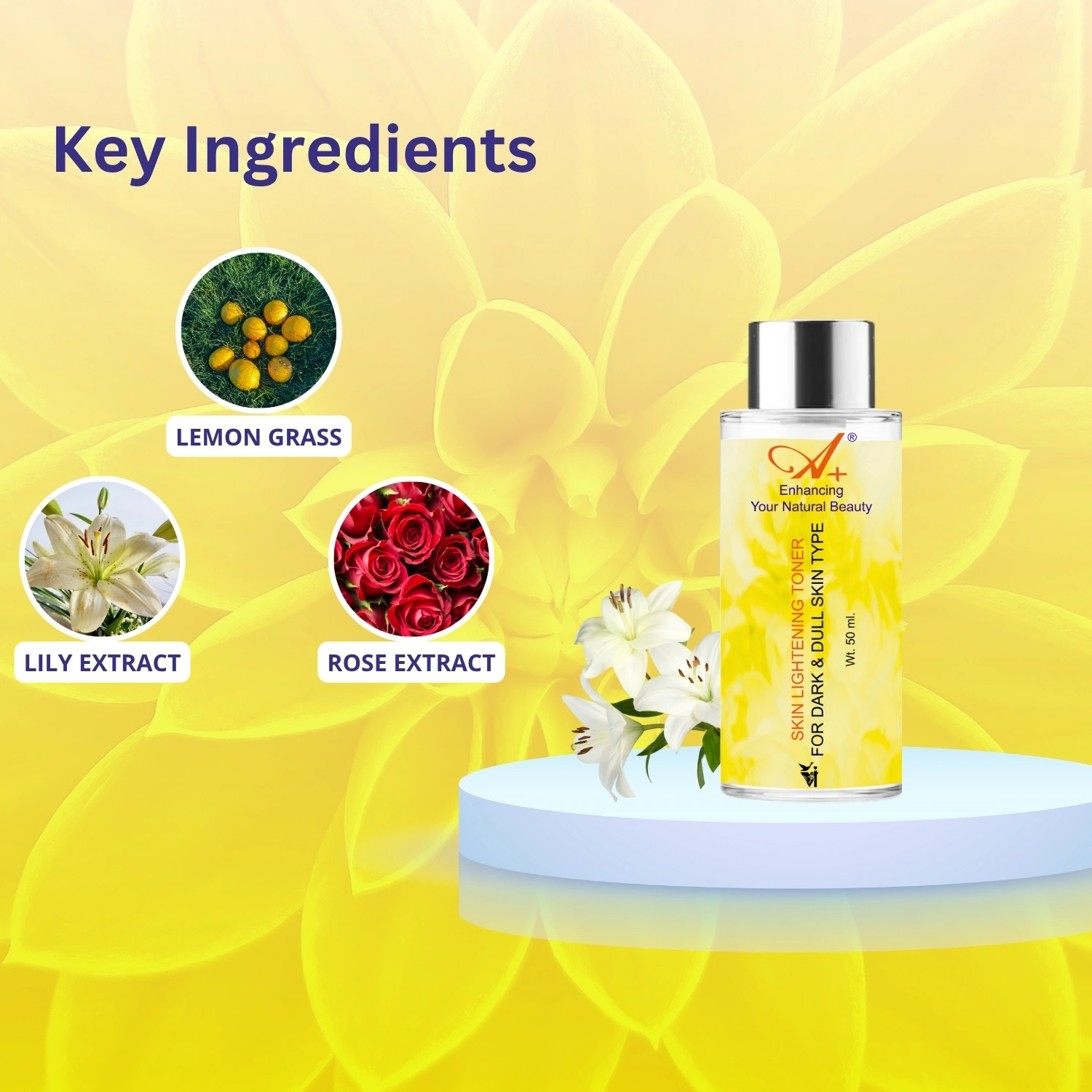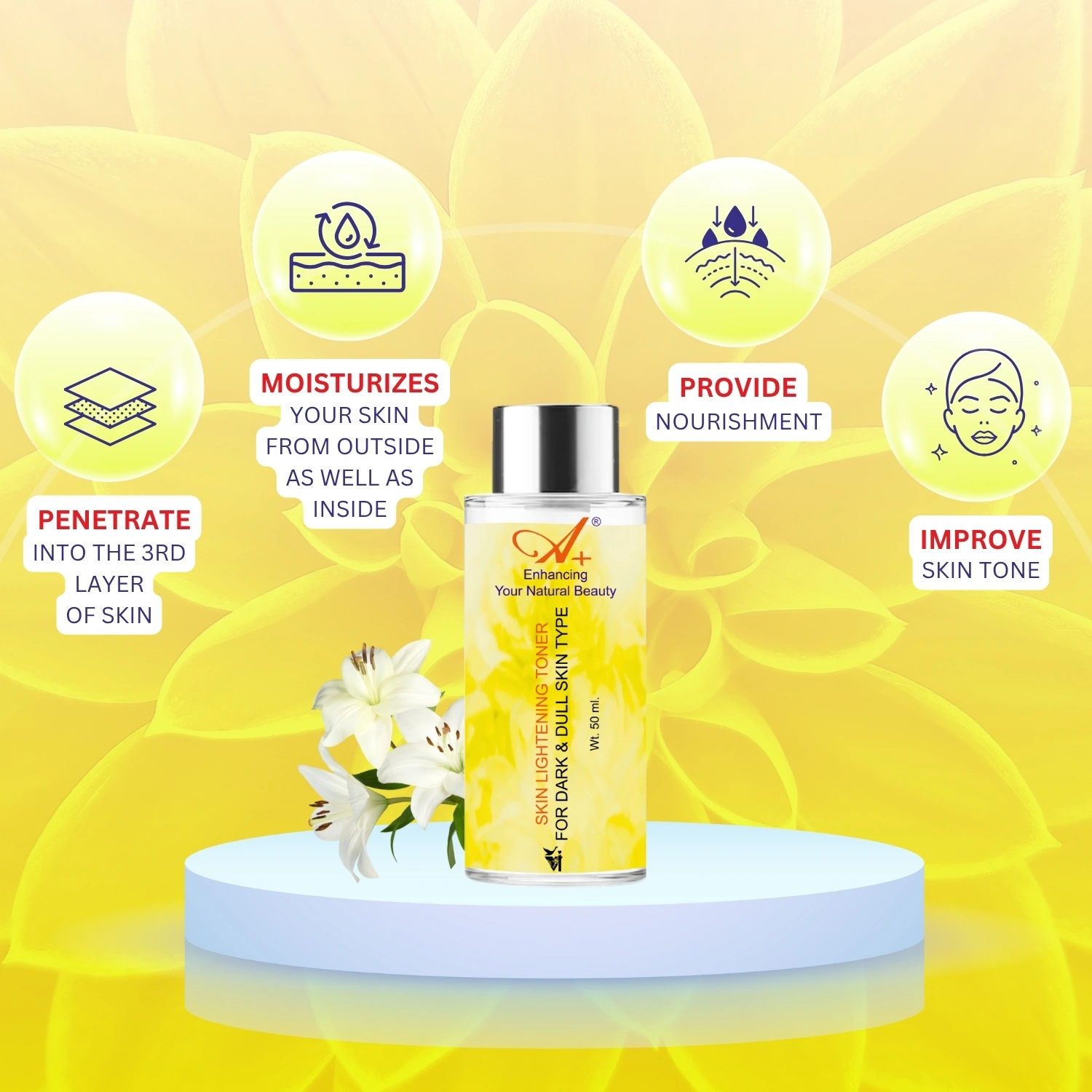 Incorporate our A+ Skin Lightening Toner (50ml) into your daily skincare routine and experience visibly brighter, well-hydrated, and glowing skin with every use!