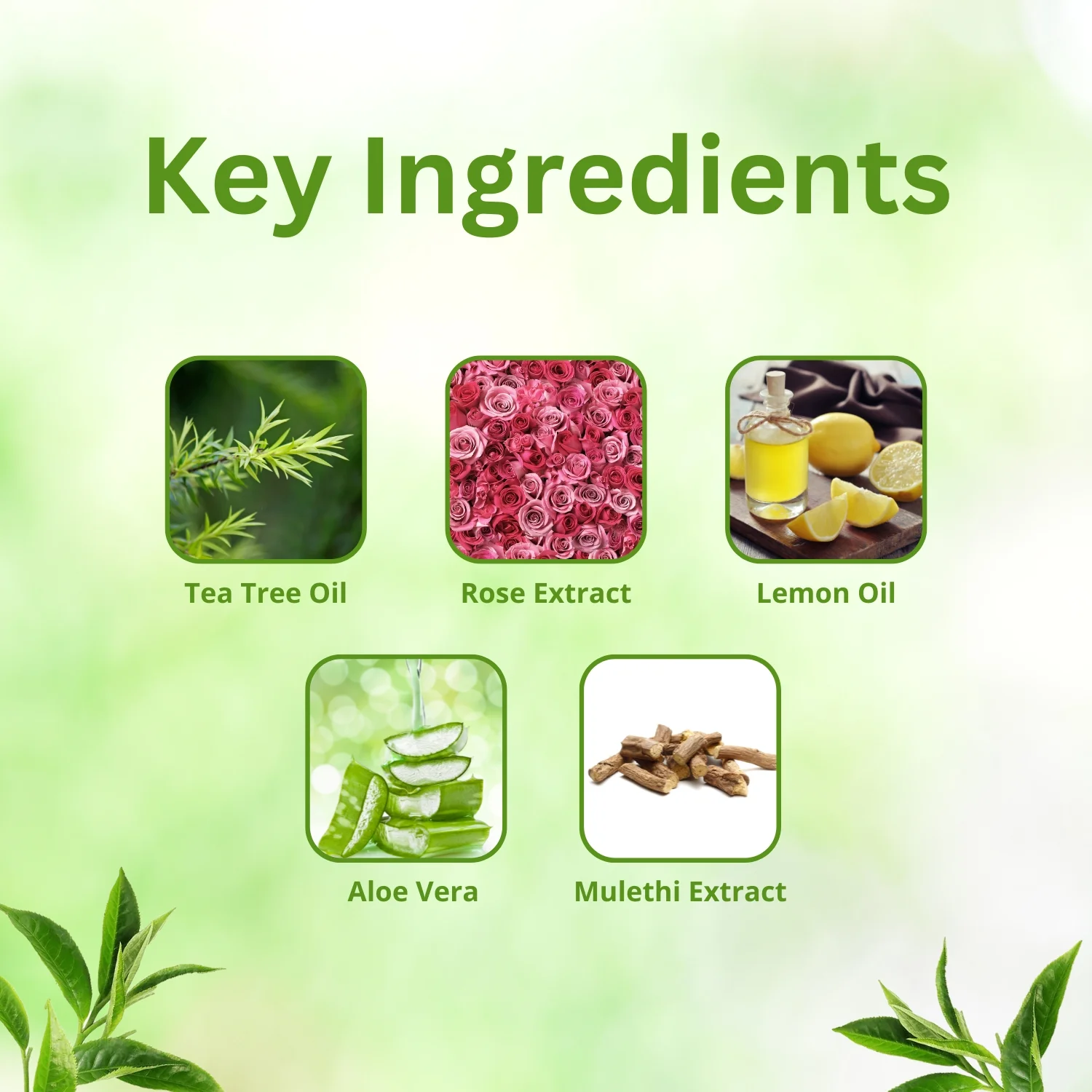 Aqua, Distillates of Rose, Aloe Vera Extract, Botanical Extract, Tea Tree Oil, Tulsi Leaves, Pearl Powder, Lemon Oil, Mulethi Extract, Preserving, Fragrance.