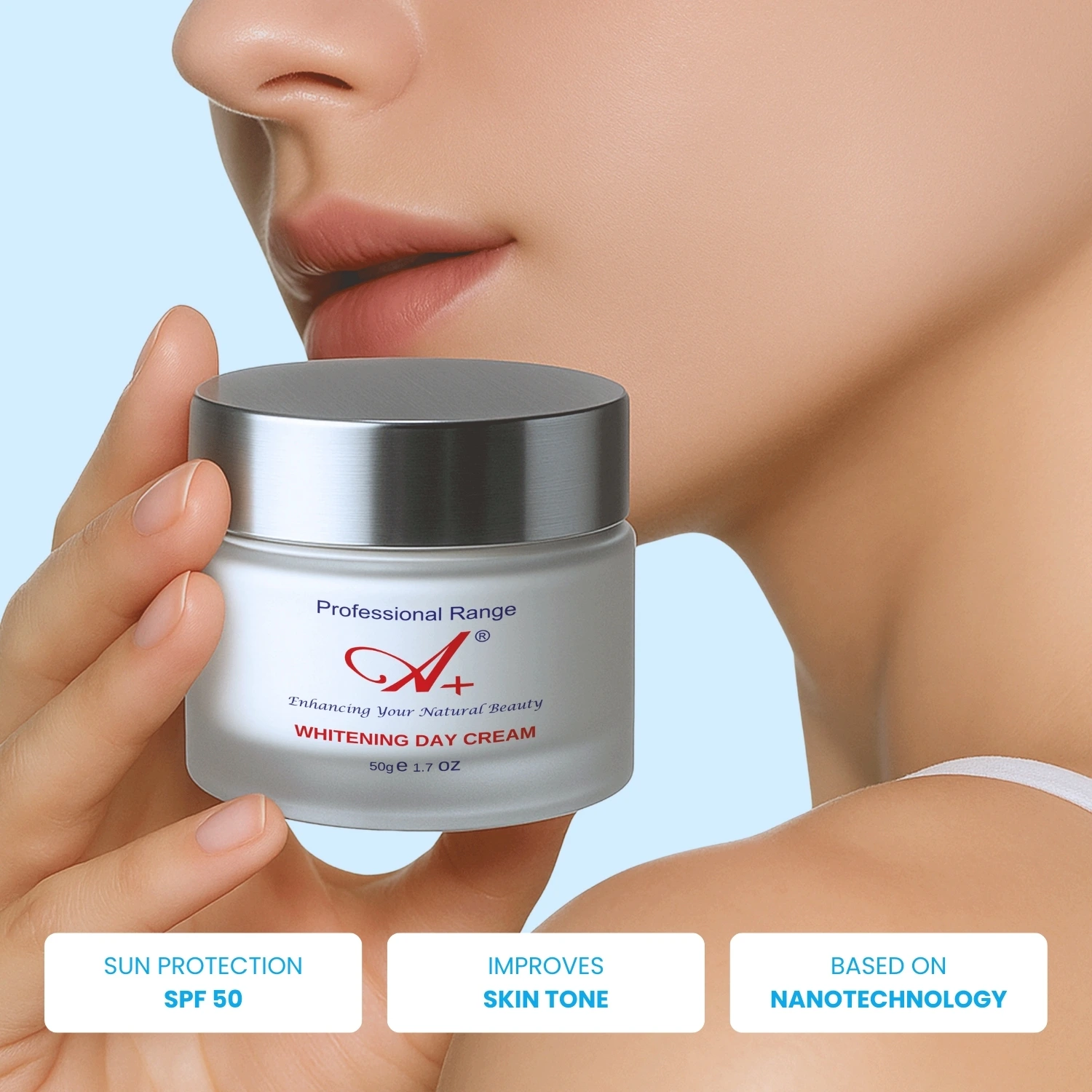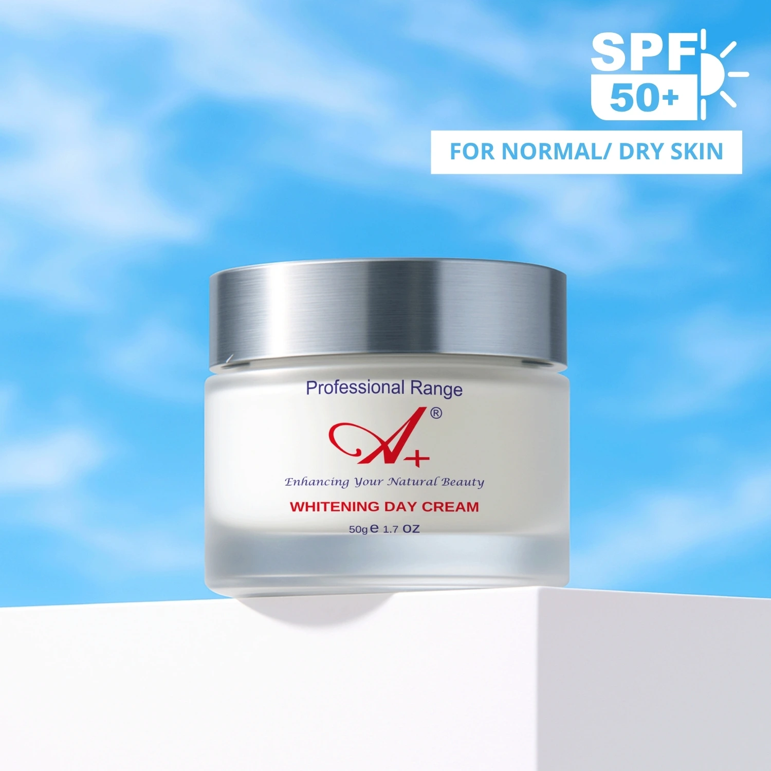 - Discover the perfect synergy of sun protection and brightening with our SPF 50 enriched A+ Whitening Day Cream.
